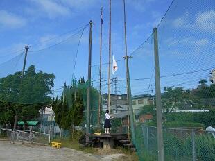 本校では、毎朝・毎夕に国旗・市旗・校旗の掲揚と降納を行っています。生徒会役員の仕事の一つとして、毎日頑張っています。