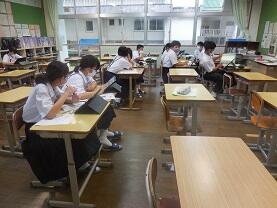 6月に入って、気温や湿度が高い日は各教室の空調設備を動かしています。この日も大変暑い日でしたが、快適な環境の中で集中して授業に取り組む様子が見られました。音楽室などの特別教室は空調設備がないため、扇風機をフル稼働しています。