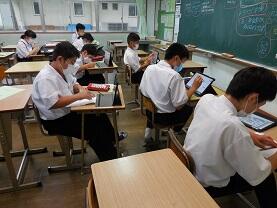 午前中は、やや蒸し暑かったようですが、空調設備のある学級では快適に授業が行われていました。その一方、理科室・数学学習室・技術室・美術室では扇風機のみで頑張ってました。