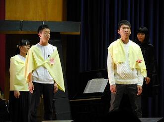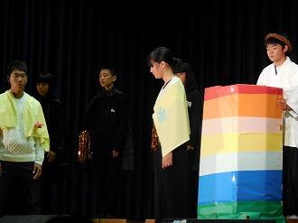 そして、3年生ですが、中学校最後の旭祭ということで、とても力が入った素晴らしい発表でした。テーマは、「国際理解」しかも、とても難しい「飢餓」や「貧困」について考えさせられるものでした。特に劇は、真剣な演技で、観客を引きつける素晴らしいものでした。自分の未来がどんなにつらいものでも前向きに生きていかなければという、大変素晴らしい心揺さぶるものでした。観客の中には涙ぐむ人も。とにかく、3年生にとっては思い出深いものなったと思います。