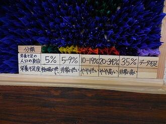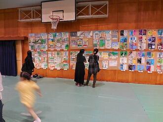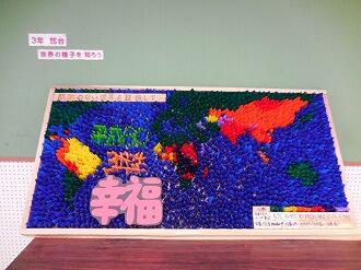 各教科の発表展示もありました。どの作品も一生懸命製作してあり見応え十分でした。特に、3年生の共同製作は、折り紙を色分けで折り、その数で世界の貧困率を表現するというすごいものでした。