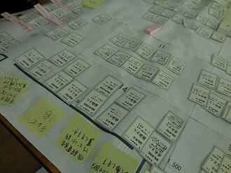 次は、3年生の様子です。班に分かれ、そこに地域の方、防災士の方が入っての活動です。この「ハグ」は、体育館等の施設の縮尺図面上で、いろいろな避難者のパターンが書かれたカードを見て、その避難者にとって避難所のどこが最適なのかを話し合って決めるゲームです。みんな智恵を出し合い、どうすればよいか(例えば、けが人、病気の人、高齢者等)を導き出します。