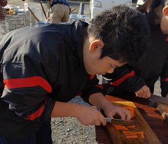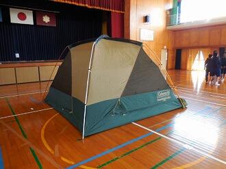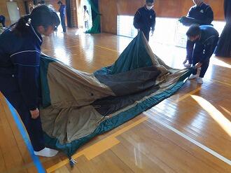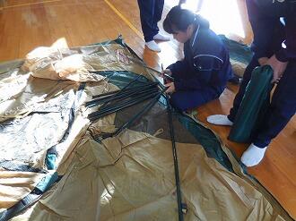 さて、2年生は、飯盒炊爨とこのテント設営を前半後半でクラスごとに取り組みました。火起こも大変ですが、このテント設営も、みんなの協力なしではできないので、結構大変のようでした。