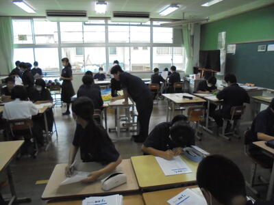 下の画像は1校時のテストの様子です。どの学年・クラスでも、真剣にテスト問題に取り組む生徒の姿がありました。
