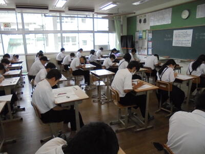 夏休みが明けて最初のテストです。夏休みの学習の成果を発揮すべく、すべての教室に真剣に問題用紙に取り組む生徒の姿がありました。特に3年生にとっては、進学に関わる貴重な機会となります。テストに臨む気持ちは、1・2年生とはまた違ったものがあることでしょう。