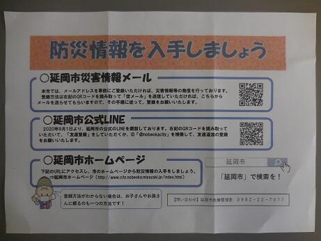 延岡市より、「防災情報を入手しましょう」のチラシが届きました。「延岡市災害情報メール」に登録すると、避難情報や竜巻情報等について早めに情報を得ることができるそうです。また、今月から「延岡市公式LINE」でも情報を伝えてもらえるそうです。