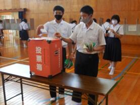 2年生6名、1年生7名が限られた3分間に、いろいろな思いを述べてくれました。演説後、延岡市役所からお借りした「記載台・投票箱」で2年生3名と1年生2名の計5名を各自投票しました。当選者の発表は、10月2日(金)に行われます。これまで昼休みや放課後の時間に準備等の仕事をしてくれた選挙管理委員や旧生徒会役員の皆さん、ありがとうございました。開票作業までよろしくお願いします。