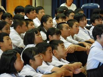6月7日(木)4校時に体育館で「人権に関する学習」が行われました。今回は、延岡の空襲を中心に平和学習の観点から実施しました。講師に、延岡市の夕刊デイリー新聞社から坂本光三郎様を迎え、当時のニュース映像や、広報用のアニメなどを紹介され、生徒にもわかりやすく講話をされました。また、実際に延岡市で空襲があって大変な被害がでているという事実もあらためて詳しく知り、生徒達も真剣に聞いていました。