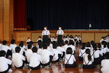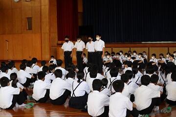 15日(木)、県総合大会・県吹奏楽コンクール推戴式を行いました。女子バスケットボール部、ソフトテニス部、陸上競技、体操競技、水泳競技の選手が、堂々と大会抱負を述べました。また、吹奏楽部による演奏も行いました。その後、学級設営コンクール表彰を文化学習委員会が行いました。