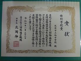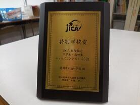 このたび、JICA国際協力中学生・高校生エッセイコンテスト2021において、「特別学校賞」を受賞しました。本校では長年にわたり継続的にエッセイを応募しています。今年も夏休みに多数の生徒のエッセイを応募しました。今回は、国際協力への貢献とその功績が評価されました。