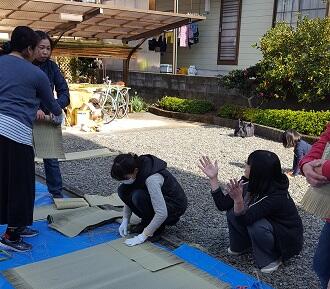 12月8日(土)に、旭校区青少協主催の門松つくり・もちつき大会が旭小学校で開催されました。これは、毎年この時期に行われていて、小中学生、保護者、地域の方が参加してにぎやかに行われているものです。青少協の役員の方が、11月24,25日に事前の竹切り等準備をしていただきました。準備の日の、25日(日)には、中学生のボランティアも入って、本番用の門松の材料作りをしました。