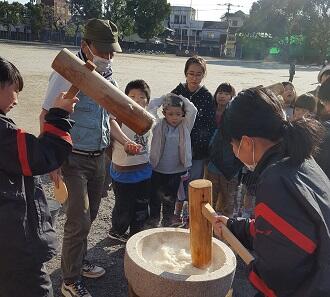 餅つきも、最初は大人がこねましたが、後は中学生が中心でつきました。中にはちょっと足下がフラフラする人もいましたが、中学生たちの餅つきはなかなか好評で、力強い音が杵でつくたびに響き渡りました