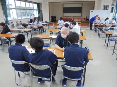 数学について苦手なところを克服したい、もっとできるようになりたい等の希望をもった生徒が多目的室に集合し、集中して学習に取り組んでいました。最終日の本日は、40名近くの生徒が集まり、自分たちで教え合ったり、本校数学の先生やはげまし隊の皆様に質問したりしながら学習を進めていました。この成果を明日からのテストに発揮してほしいと願います。