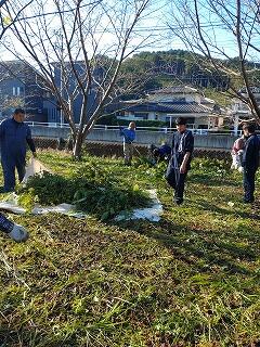 延期による影響もなく、1年生から3年生までの生徒53名、PTA12名が今回は参加しました。天候も良く、気温も上がらない早朝より活動でき、参加者も多かったため、広範囲で草を集めることができました。