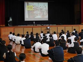 25日(月)、後期の「給食・清掃指導集会」を体育館で実施しました。前期の給食・清掃について良かった点や改善すべき点の確認がありました。新しい清掃場所では班長・副班長や、清掃の仕方について確認しました。伝統の縦割り清掃で、先輩から後輩へのバトンタッチをお願いします。