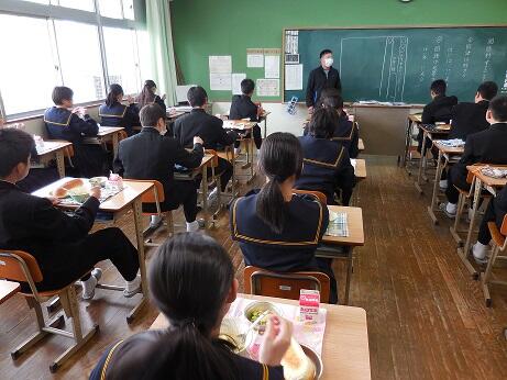 通常であれば、仲良くグループを作っての楽しい給食ですが、コロナウイルス感染拡大防止の観点から、全員前を向いて会話をしないようにしています。