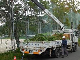 20日(水)、朝から「木の伐採作業」が行われました。テニスコート横のフェンス周辺の木が道路を覆うようになり、枯れ木が落ち危険なため業者さんに伐採をしていただきました。わずか数分でトラックの荷台いっぱいになりました。