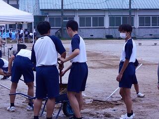 早朝より、保護者の方や生徒にグラウンドの整備をしていただき、現在放送機器や、テントの準備を行っております。9時を目安に開催いたしますので、よろしくお願いいたします。