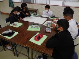 17日(火)、1年生は「危険箇所マップ・パンフレット」の作成に取りかかりました。先週、各班分担して富美山地区をまわり、危険箇所を調査しました。今回、模造紙で危険箇所マップ、A4の用紙で危険箇所パンフレットを作成し、地域の方々にもお知らせできるようまとめています。