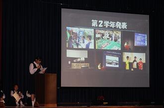 2年生の発表です。「修学旅行に向けての学び~京都の魅力を教えます。というテーマで発表でしたが、実は2年生は9月に修学旅行に行くはずだったのですが、台風のために延期になりました。そのため、今回の発表も内容を変更せざる負えなかったのですが、とてもわかりやすくまとめていました。