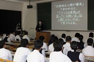 30日(金)5・6校時、3年生が九州保健福祉大学を訪問し、①「ペットと防災」②「災害弱者といわれる人への支援」を学びました。自らの命やペットの命を守り、他者を助ける行動を学ぶことで、中学生がするべき避難所補助・避難所運営について考える良い機会となりました。
