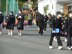 27日(火)、登校の様子です。各学年で色の違う「健康状態確認カード」を持って、3年生は正門付近で本人・同居家族の健康状態を確認して校舎に入っています。1・2年生は下足室前で確認しています。毎日登校前の保護者チェックのご協力ありがとうございます。