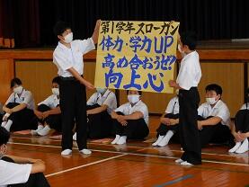 中学校に入学して、初めての学年集会がありました。はじめに学年プログラム委員会のメンバーが、自己紹介をして、「こんな学年にしたい」「こんな取組を頑張る」といった抱負を述べました。次に、「各学級の良い点と改善すべき点」を発表しました。また、「学年スローガン」の発表もありました。最後に、全員で挨拶の練習をして終わりました。人前で堂々と自分の考えを伝える姿や、仲間の発表に耳を傾ける真剣な姿が見られました。