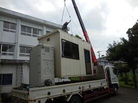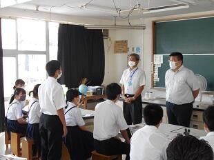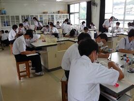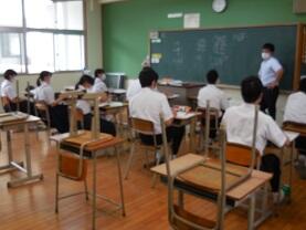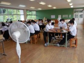 午前中は、やや蒸し暑かったようですが、空調設備のある学級では快適に授業が行われていました。その一方、理科室・数学学習室・技術室・美術室では扇風機のみで頑張ってました。
