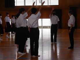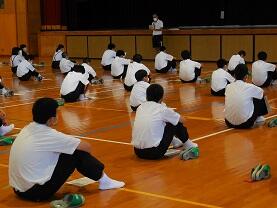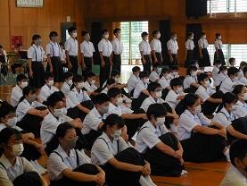 もうすぐ開催される「中学総体」でのマナー(旭中学校生徒としての誇り等)について、大久保教諭から話がありました。またコロナウイルス感染拡大防止のため、大会での注意事項(保護者応援の人数制限、マスク着用と消毒徹底、大会前からの検温記録等)について説明がありました。どの部も真剣な態度で聞き入っていました。その後、服装容儀検査を行いましたが、髪の毛と爪が伸びている生徒が数名いたようでした。