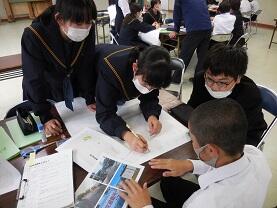 17日(火)、1年生は「危険箇所マップ・パンフレット」の作成に取りかかりました。先週、各班分担して富美山地区をまわり、危険箇所を調査しました。今回、模造紙で危険箇所マップ、A4の用紙で危険箇所パンフレットを作成し、地域の方々にもお知らせできるようまとめています。