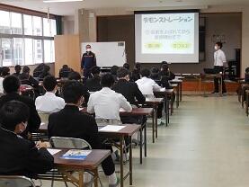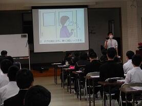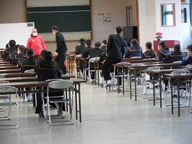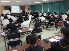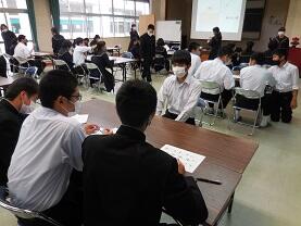20日(金)山﨑教諭の研究授業(3年1・2組総合的な学習の時間)を行いました。「面接の全体の流れを確認し、面接におけるマナーを理解しよう」の目標で、入室・退室の際の注意事項を「悪い例」を見て話し合い、その後、各グループごとに面接練習とその評価をしました。生徒は、真剣な態度で参加し、メリハリのある中で主体的に取り組む姿が見られました。