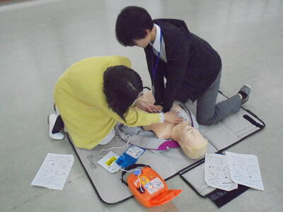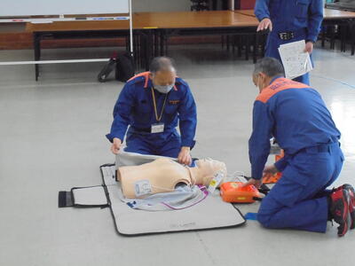 延岡市消防本部から3名の職員の方にお越しいただき、講師を務めていただきました。救助者発見から心肺蘇生の流れを説明していただき、その後訓練用の人形やAEDを用いて実際に操作の確認を行いました。