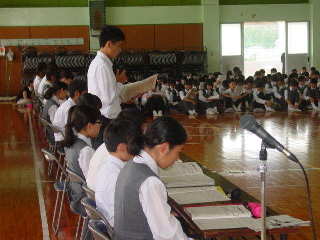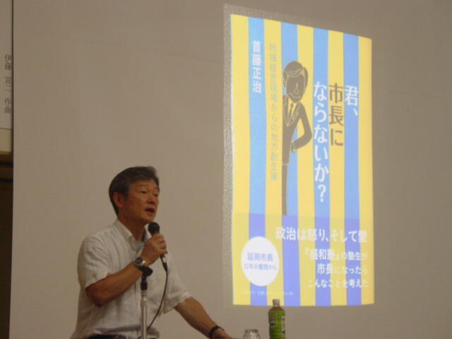 講師に、前延岡市長 首藤正治さんに来ていただき、「君、市長にならないか?」という演題で講演をしていただきました。首藤さんは西階中学校出身で、中学校、高校、大学、会社員時代、市長になってからの話などを体験談をまじえながら話していただきました。後半はパネルディスカッションを行い、中学生の質問に詳しく答えていただきました。