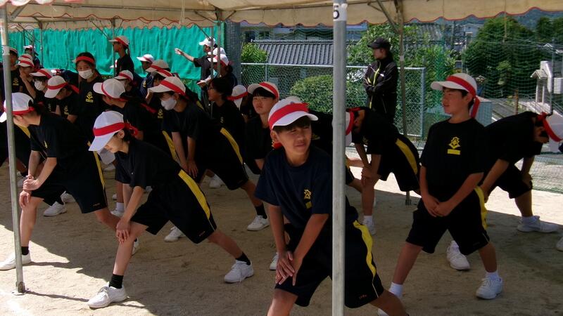 練習が始まり、まず、ストレッチを行うと、その後、勢いよく行進し、各団に分かれ、各競技の準備を行いました。