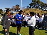 練習後の選手に「選手名鑑」を手渡しし、写真を撮ってもらったり、握手をしてもらったりしました。