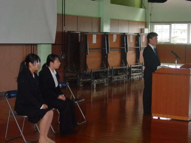 5月28日(月)から6月15日(金)までの3週間、本校出身の3名の教育実習生がきています。今日の全校集会であいさつをしていただきました。すばらしい先生になられるようにみんなで協力、応援していきましょう。