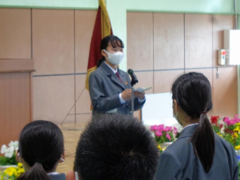 続けて行われた始業式では、2年生代表 山本彩乃さん、3年生代表 清田みなみさん、生徒会代表 若松愛莉さんによる発表が行われました。久しぶりに行われた集会でしたが、静かな雰囲気で聞く態度もよく、素晴らしいスタートをきることができました。