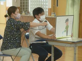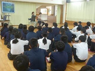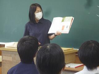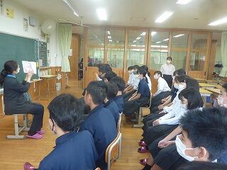 コットンロードが出来上がるまでの流れを、先生方が事前に準備した紙芝居を使って紹介。興味津々で話を聞く生徒の姿が大変印象的でした。