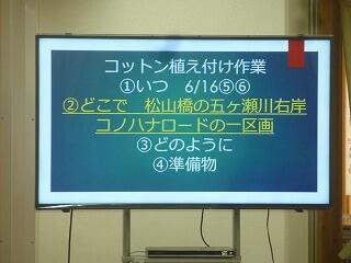 1年生は、6月16日の総合的な学習の時間を利用して、自分たちが種から育てたコットンの苗の植え付けに参加します。当日は、五ヶ瀬川河川敷で作業を行いますが、今回その事前学習会を実施しました。