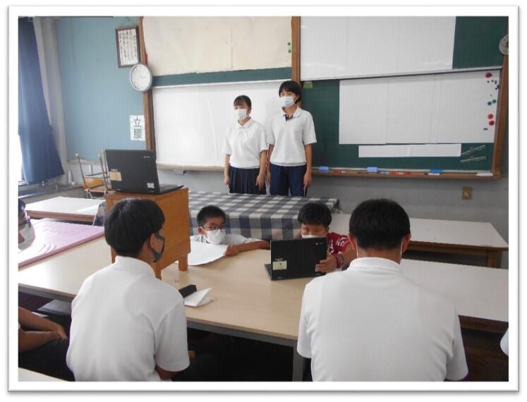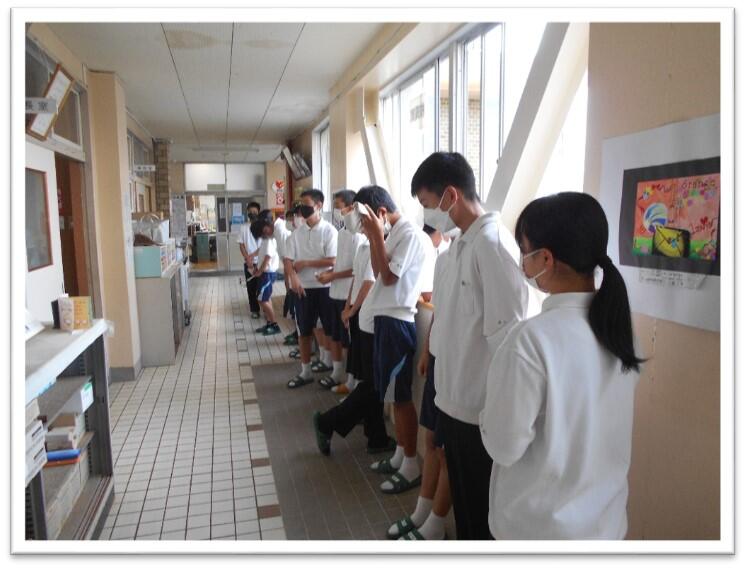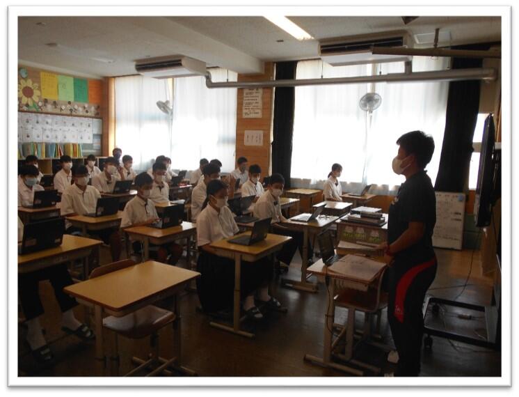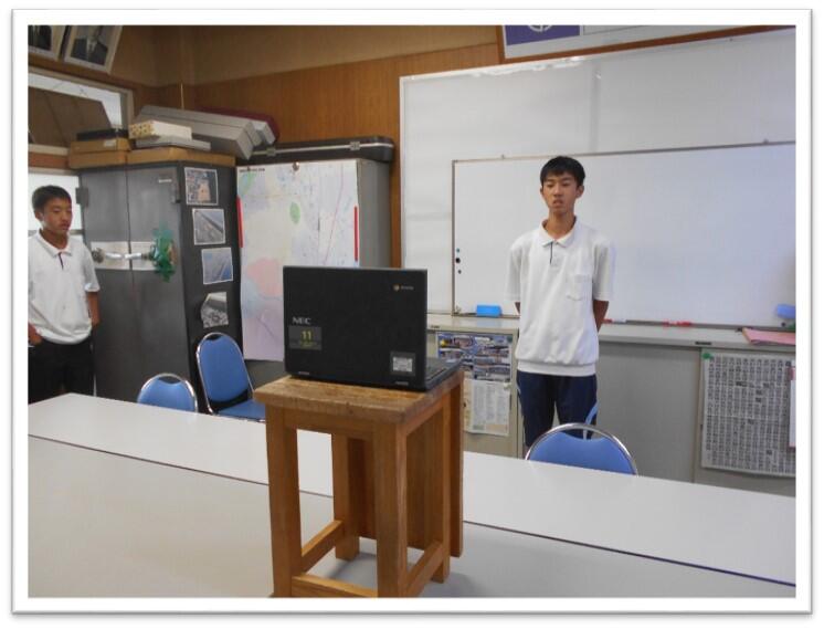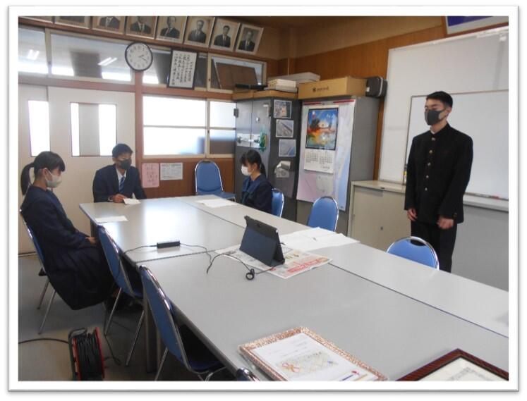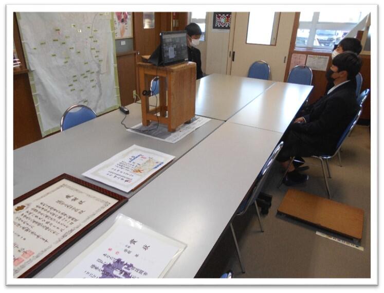 コロナの影響で、今回もリモート開催です。校長室を会場に、ます、表彰を行い、その後、各学年代表と生徒会代表の4名が、1学期の反省を発表しました。
