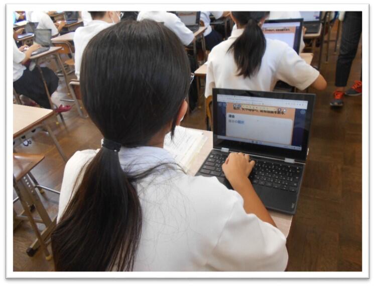 キュビナ(AI型学習アプリ)やロイロノートを使って、活発な議論のできる授業です。