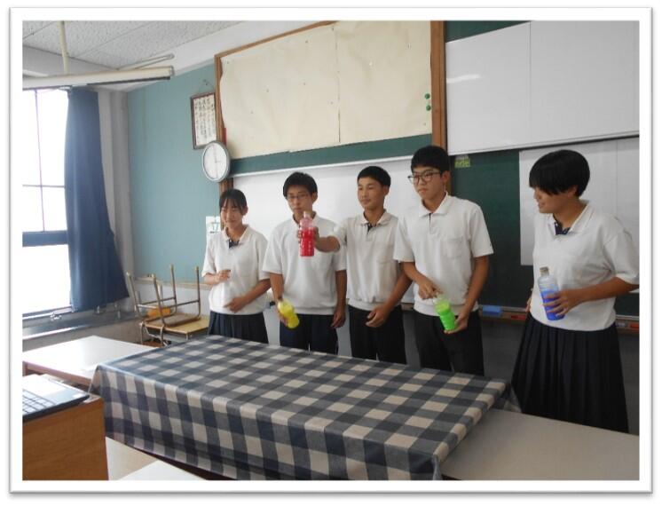 合図でペットボトルを振ると・・・色が変わりました。これで団の色が決定です。