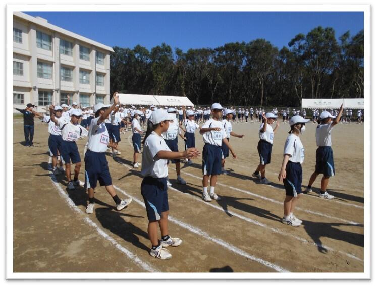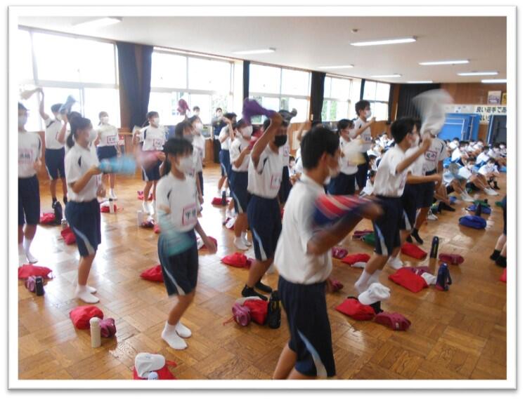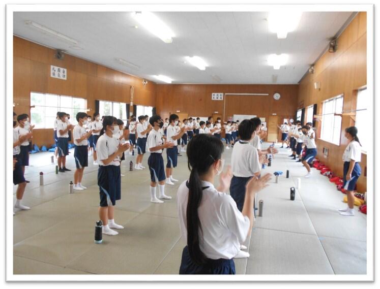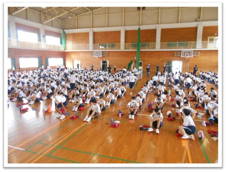 3年ぶりに全校体育を実施しました。あいにくの雨で、体育館での実施です。全校生徒が集まるのも4ヶ月ぶりです。