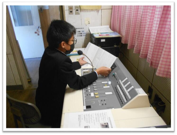 校長室の隣にある放送室から、各学年の代表生徒及び生徒会執行部の生徒が3学期の抱負を読み上げました。
