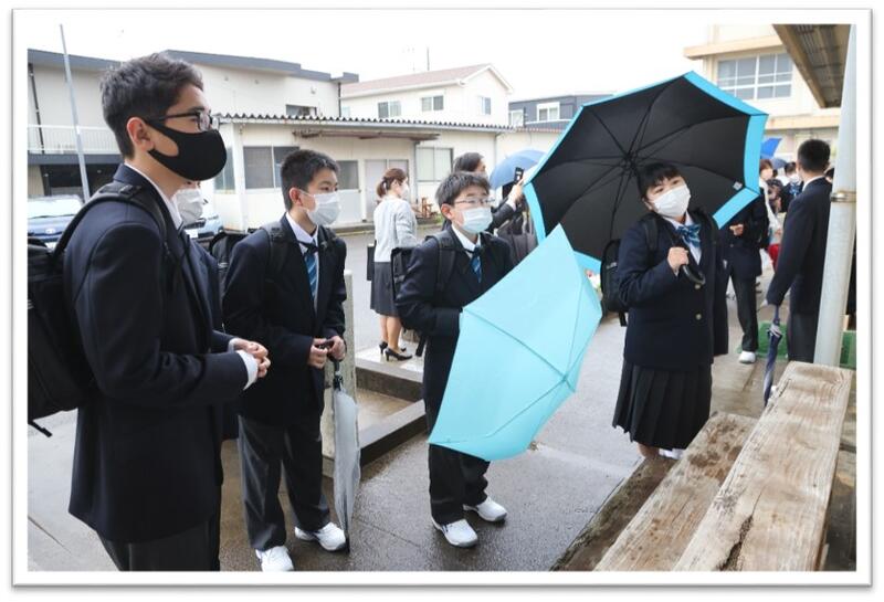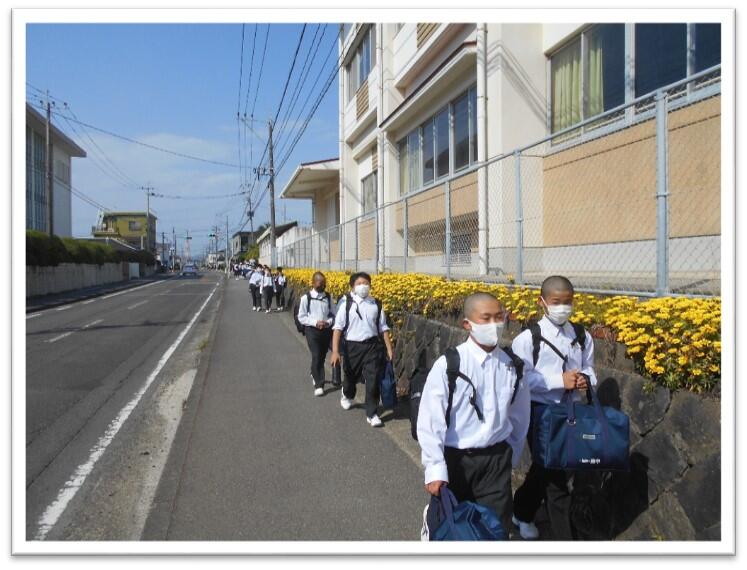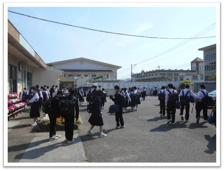 全校生徒508名が一斉に下校すると、密な状態ができてしまいますので、帰りの会終了時刻を5分ずらして下校しています。