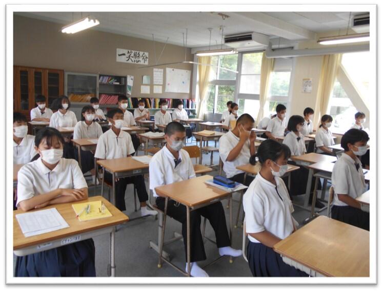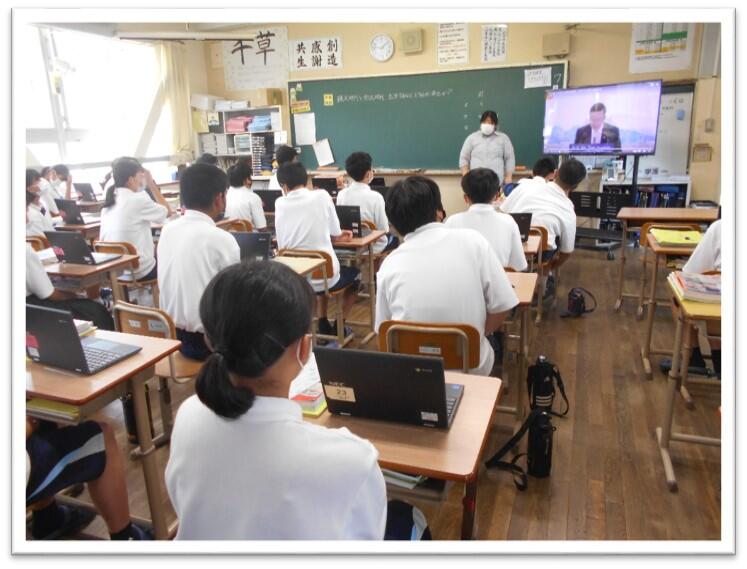 コロナの影響で、今回もリモート開催です。校長室を会場に、ます、表彰を行い、その後、各学年代表と生徒会代表の4名が、1学期の反省を発表しました。