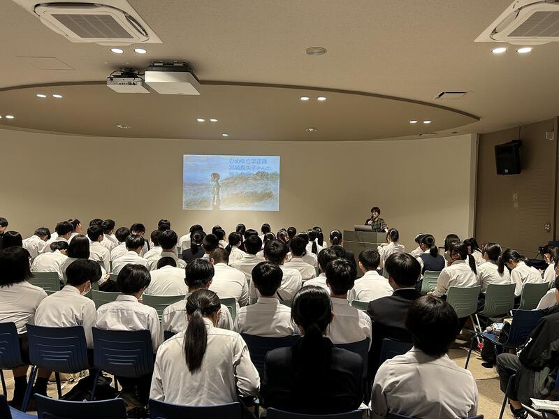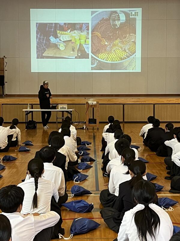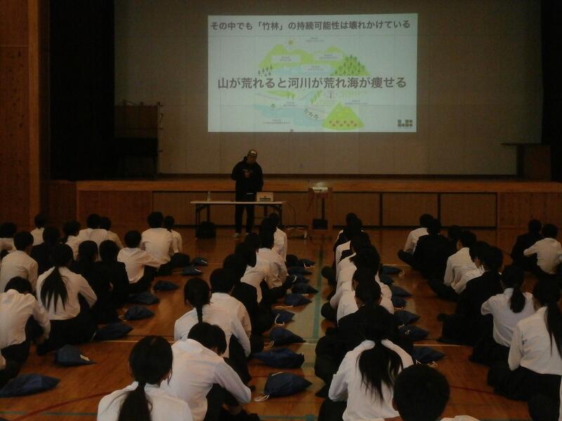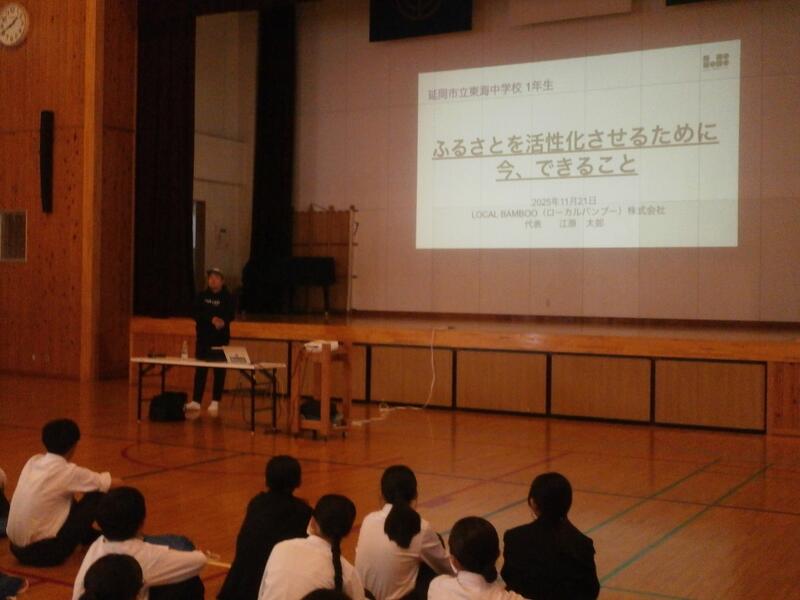 11月21日(金)の5・6校時に、1年生のふるさと学習の1つとして、「LOCAL BAMBOO株式会社」の江原太郎様から講話をいただきました。江原さんは、大学卒業後に実家近くの放置竹林の問題に直面し、竹を地域資源にできないかと「延岡メンマ」を開発し、農業で地域を変えたいという夢の実現を達成できたことなどのお話をしていただきました。その中で、「資源に無駄なものはない。すべてのものが循環して生活を潤していることに気づく力を持ってほしい」、「想像力を培ってほしい。失敗も多く経験してほしい。必ず次につながる。そのための一歩を大事にしてほしい。」など貴重なお話をたくさんしていただきました。現在、1年生は、総合的な学習の時間で「延岡の課題」を、個々で調べ学習をしており真剣に話を聞いていました。また、「資源に無駄なものはない。」という言葉が印象に残った生徒も多く、持続可能な社会をつくっていきたいと感想に書いている生徒もたくさんいました。1年生にとって、たいへん素晴らしい時間になりました。江原様、東海中学校の子どもたちそして延岡の子どもたちの未来のために本当にありがとうございました!