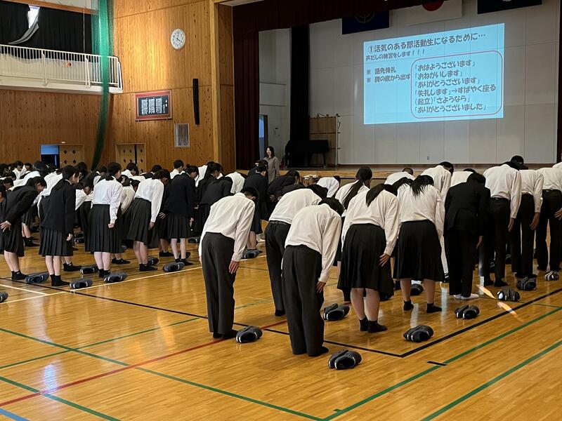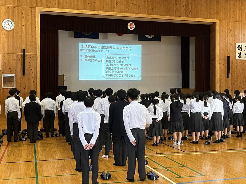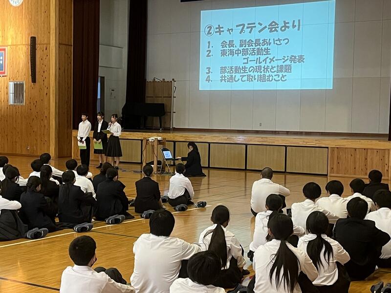 1、2年生の新チームになって、3度目の部活動生集会を11月21日(金)に実施しました。今回は、東海中学校部活動生ゴールイメージ発表、部活動生の現状と課題、共通して取り組むことについての集会となりました。ゴールイメージは、「人任せにせず、東海中を背負っている自覚をもつ ~信頼、活気のある部活動生へ~」となりました。また、部活動生の現状と課題では、「顧問の先生がいないときにうるさくなってしまう。あいさつができている人とできていない人がいる。」の2点が出され、そのための打開策として、各部でミーティングを行い、課題に対して取り組む事などが、キャプテン会会長の寿崎結菜さんから提案されました。東海中学校が、「子どもたちの考えで、自ら動こうとしています。」大変うれしいことです。