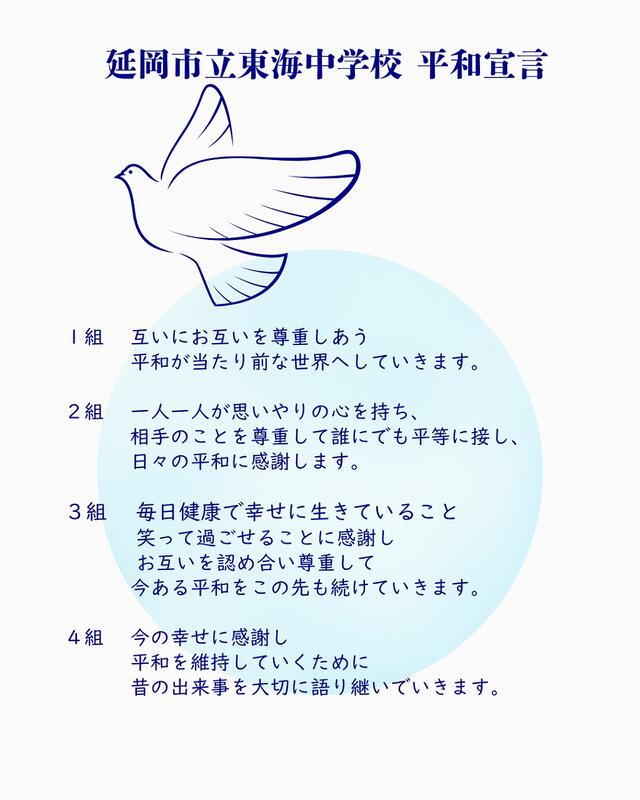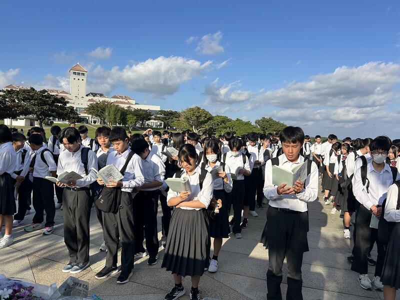 修学旅行1日目、「ひめゆりの塔」「平和祈念資料館」の様子です。「平和祈念資料館」の近くの「平和の礎」で、各クラスがクラスごとに決めた「平和宣言」をクラス全員で読みました。2年生が作成した「東海中学校平和宣言」も掲載しました。この後、宿泊先の「那覇セントラルホテル」へ移動です。