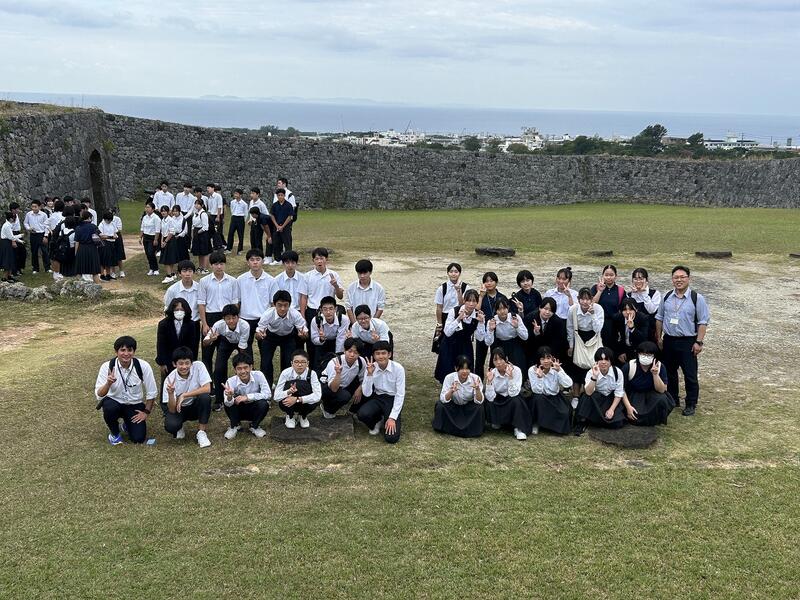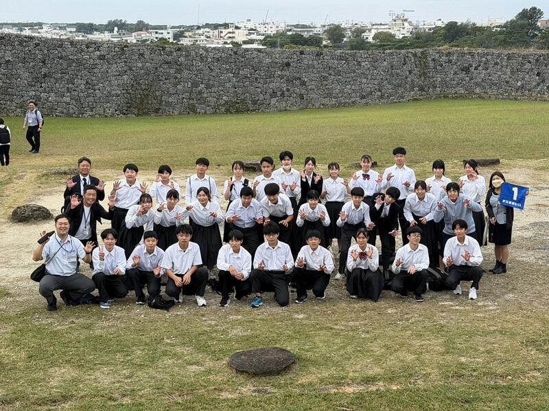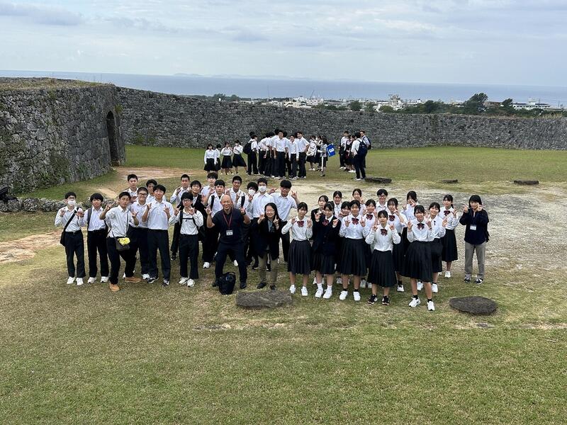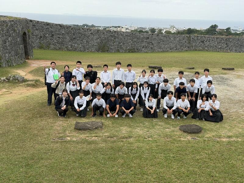2日目の午前、世界遺産にも登録されている座喜味城址の集合写真です。この後、昼食は「タコライス」、午後は「美ら海水族館」です。